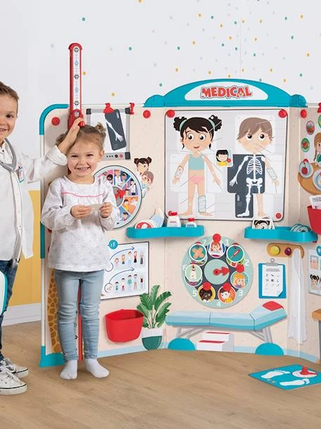 - De nombreuses fonctions liées à l’univers de la médecine sont reprises : coin radiologie, reconnaissance des parties du corps, partie nutrition, échelle optométrique, horloge des bobos, échelle de croissance, toise avec équerre jusqu’à 1m20, pèse-personne factice, horloge expliquant le déroulement d’une consultation, et bien d’autres encore…