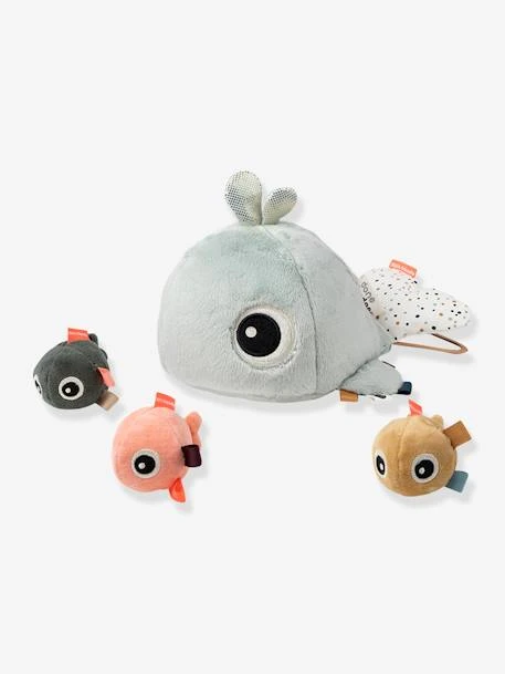 Craquez pour cette adorable baleine Wally, accompagnée de ses petits amis poissons ! La joyeuse baleine aime jouer à cache-cache. Découvrez comment les petits poissons se cachent à l’intérieur de Wally. Chaque poisson émet un son différent : une clochette, un bruit de papier et un carillon encourageront les petits à ramper derrière eux. Laissez votre petit bout découvrir les petits poissons, les différentes textures de la baleine ainsi que le miroir caché sur sa nageoire. Les étiquettes colorées et le jet d’eau seront également de belles surprises ! Ce jouet d’éveil va bien amuser les petits tout en développant leur concentration et leur coordination œil-main.
