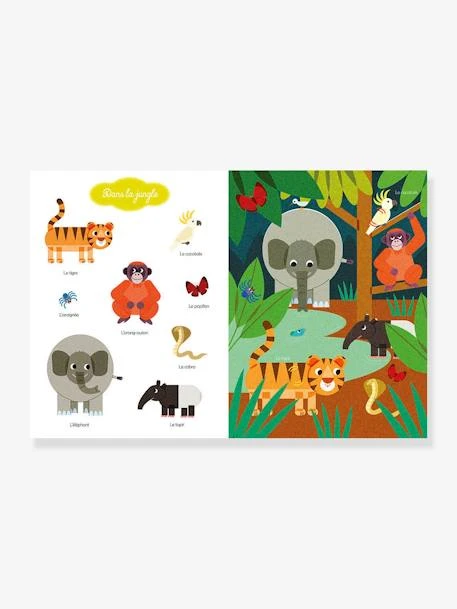 Mes Premiers Animaux à écouter est un livre sonore où chaque double page représente un milieu naturel comme la jungle ou la savane. La page de gauche est un imagier avec chaque animal isolé et la page de droite est une mise en contexte des animaux. Avec ce livre, votre enfant pourra s’amuser à retrouver les animaux mais ce n’est pas tout, des puces sonores feront retentir le cri d’un animal afin d’encore mieux les connaître !