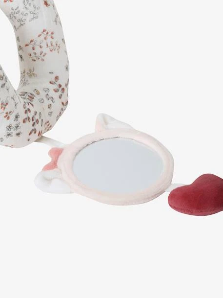 - 3 jouets suspendus par des liens : – 1 anneau transparent à billes colorées avec une balle cupcake suspendues – 1 souris habillée avec 2 anneaux en plastique – 1 miroir avec oreilles de chat et un coeur en volume suspendu