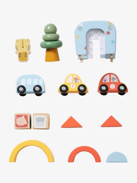 - 6 activités : un circuit, une arche car-wash, un jeu des engrenages, 2 bouliers, un arc en ciel à empiler et un arc-en-ciel à faire glisser