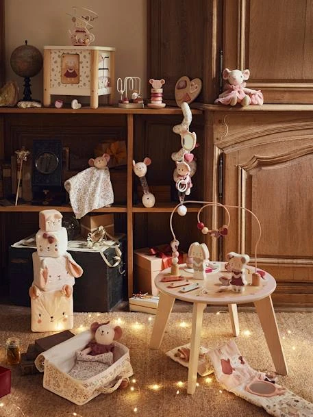 - A l’intĂ©rieur : 1 doudou souris, 1 oreiller et 1 couette